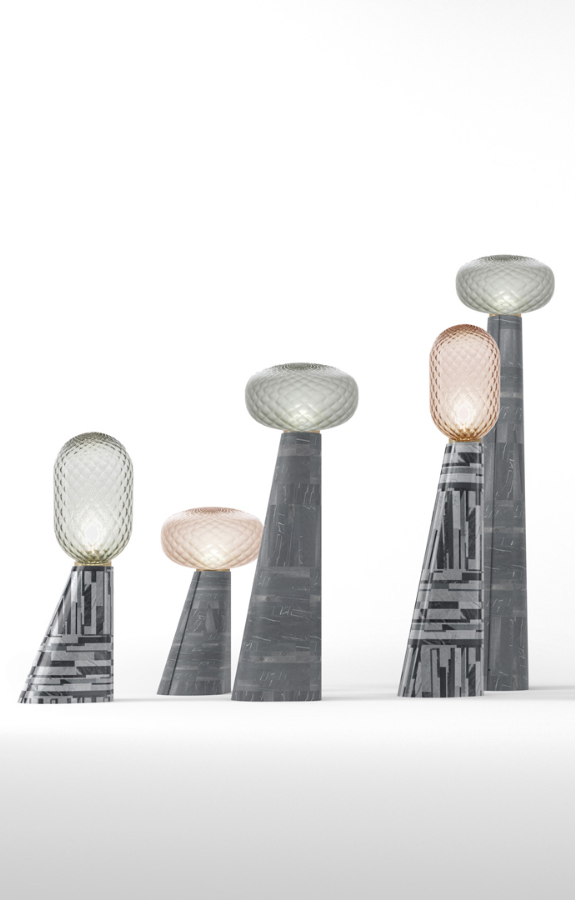 Nella versione originale, la lampada Bloom firmata Matteo Zorzenoni, ricorda la preziosità delle bottiglie di profumo antiche e la forma dei diffusori orientali di essenze. Per Brand & Stone 3.0, Giorgio Canale interpreta le forme di queste bellissime lampade da tavolo de Il Fanale, creando una composizione da terra denominata Seven Blooms. Preziosi vetri color pastello, altezze irregolari e finiture in contrasto, esaltano la matericità delle pietre riciclate by Stonethica e creano un insieme dinamico e dal forte carattere. Per Seven Blooms sono stati selezionati i materiali Carrara Mix, l’insieme di tutti i materiali di Carrara e Pietra Grey, caratterizzato dai toni caldi grigio-marrone, con leggere venature bianche.