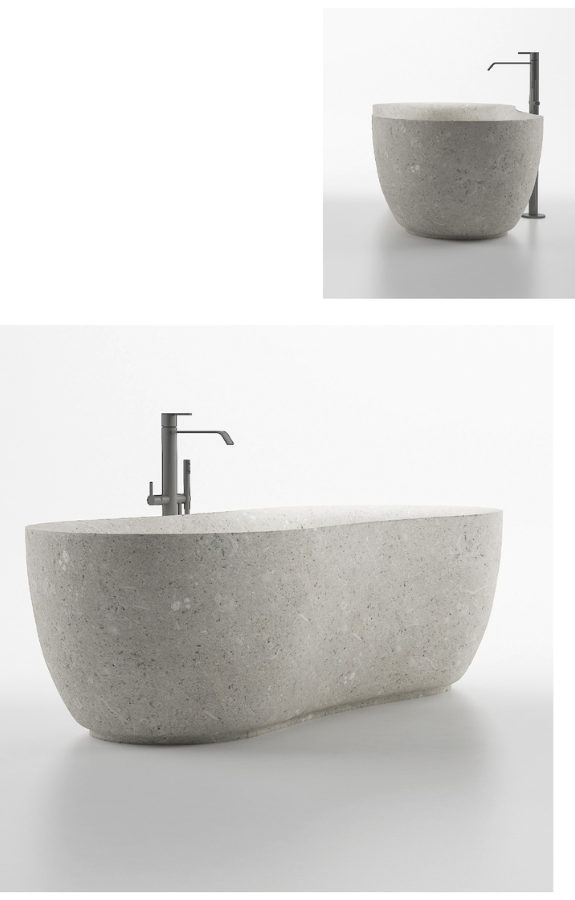 La vasca Fida è ispirata alla natura. Fida è una vera e propria scultura scavata da un monolite di Pietra di Vicenza Grigio Alpi Spazzolato. Il materiale dal tipico colore grigio chiaro, caratterizzato dalla presenza di macrofossili, dona alla vasca Fida un moderno incontro tra materia e funzionalità. La linea esterna prende spunto dalle forme organiche dei legni dei fiumi, che conferiscono all’opera una sensazione di fluidità. Gli spigoli sono smussati e le linee morbide. L’interno della vasca è un ambiente ergonomico e accuratamente studiato per trasmettere sicurezza e comfort.