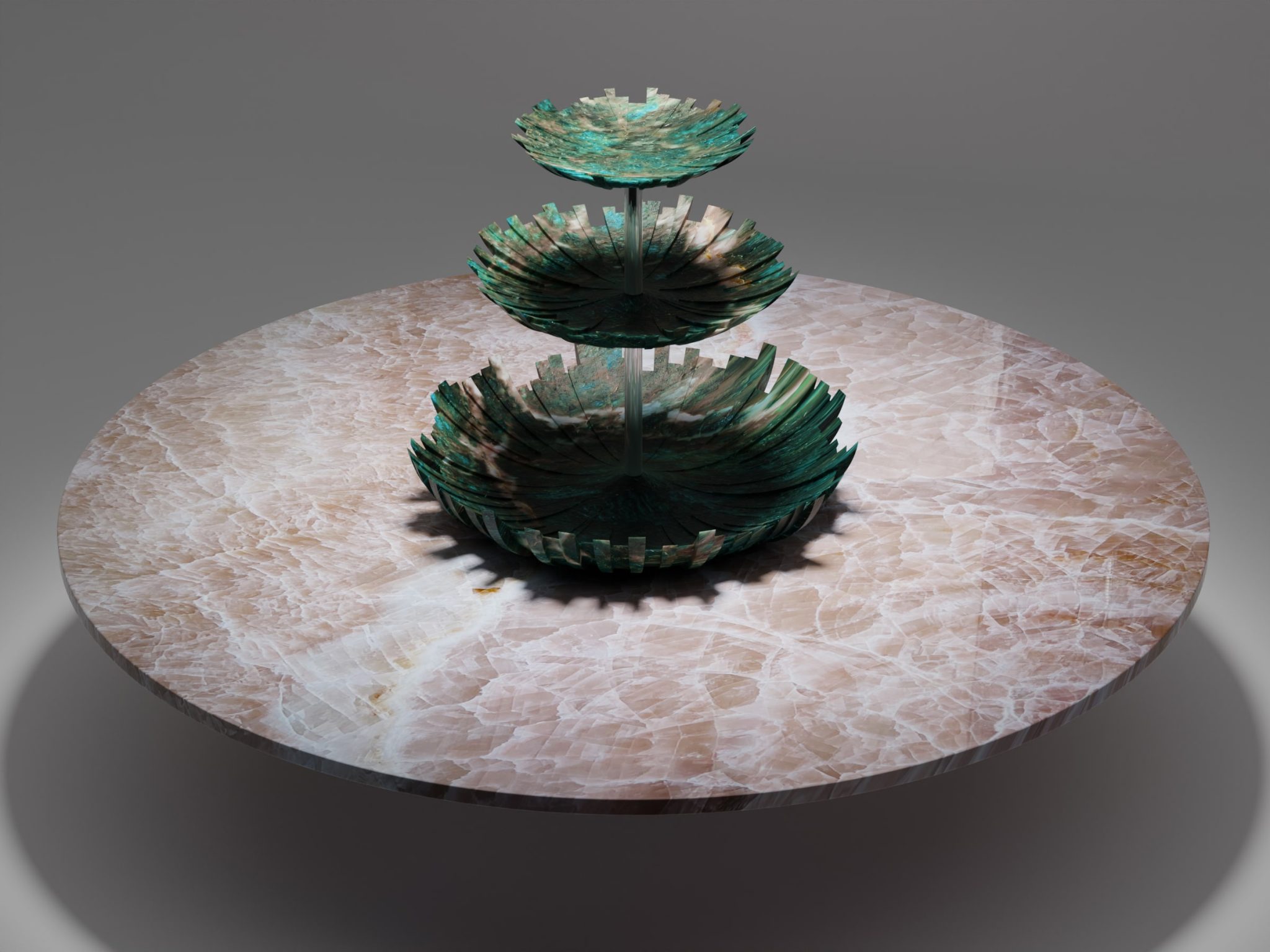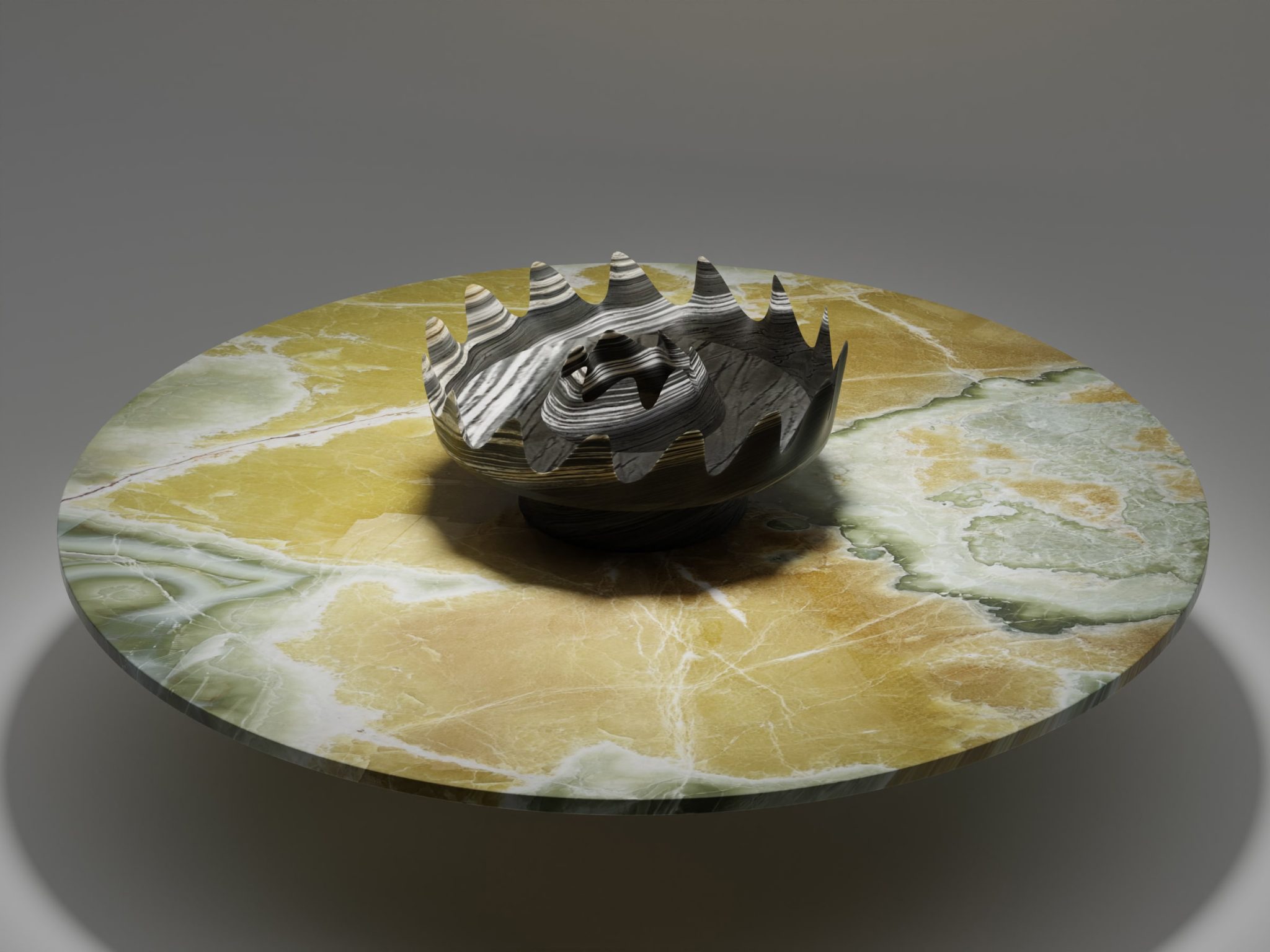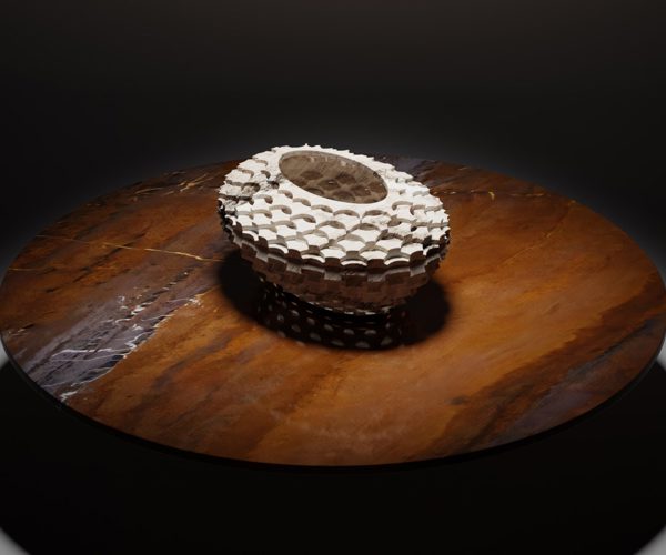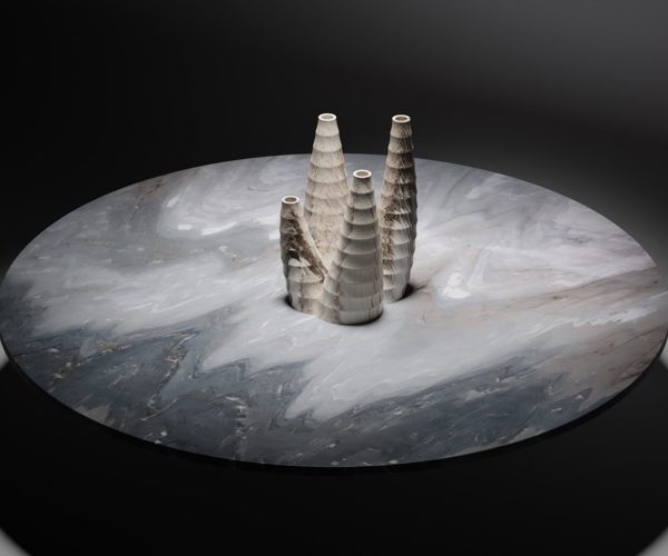 Sia gli elementi dentellati che la base conica del centrotavola sono ottenuti dallo stesso massello di marmo tagliato a water jet concentricamente. Le superfici ondulate e il profilo seghettato delle corone sono la logica conseguenza dei tagli consecutivi incrociati.