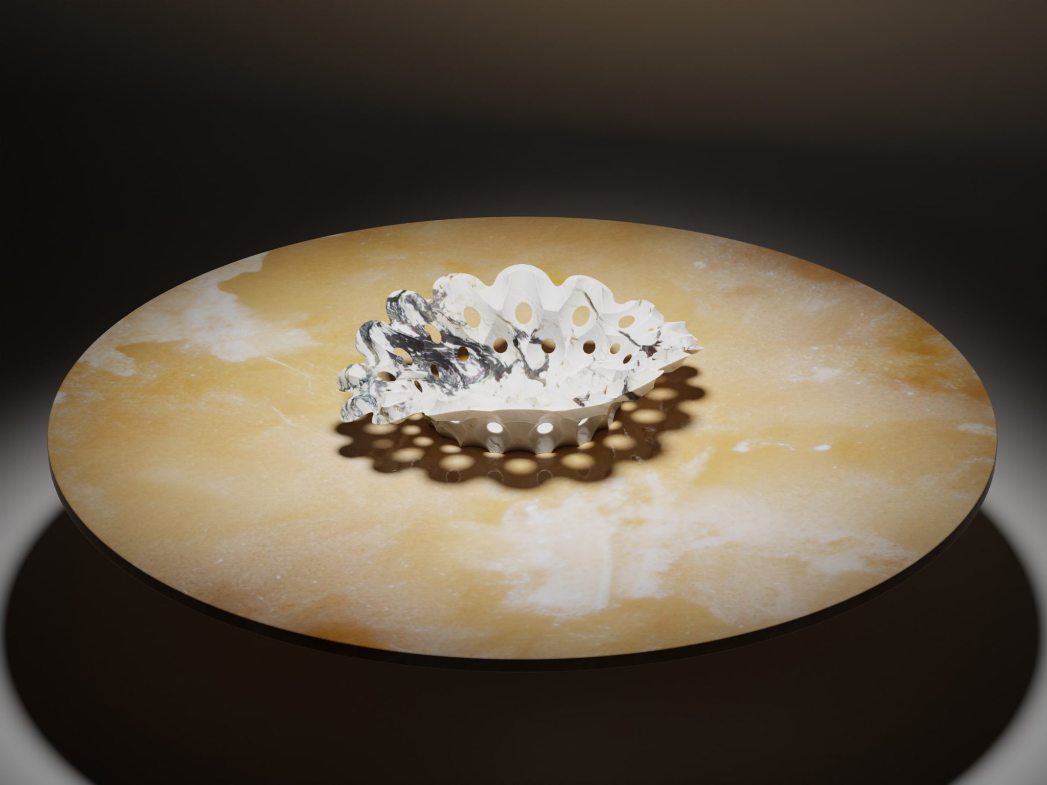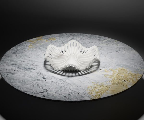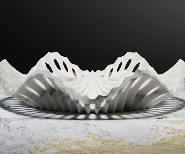 La forma stirata e traforata del centrotavola deriva dall’intreccio contrapposto di precisi percorsi di fresatura. L’utensile semisferico, movimentato precisamente da un controllo a cinque assi, produce non solo la forma del catino, ma anche la fine levigatura della superficie risultante.