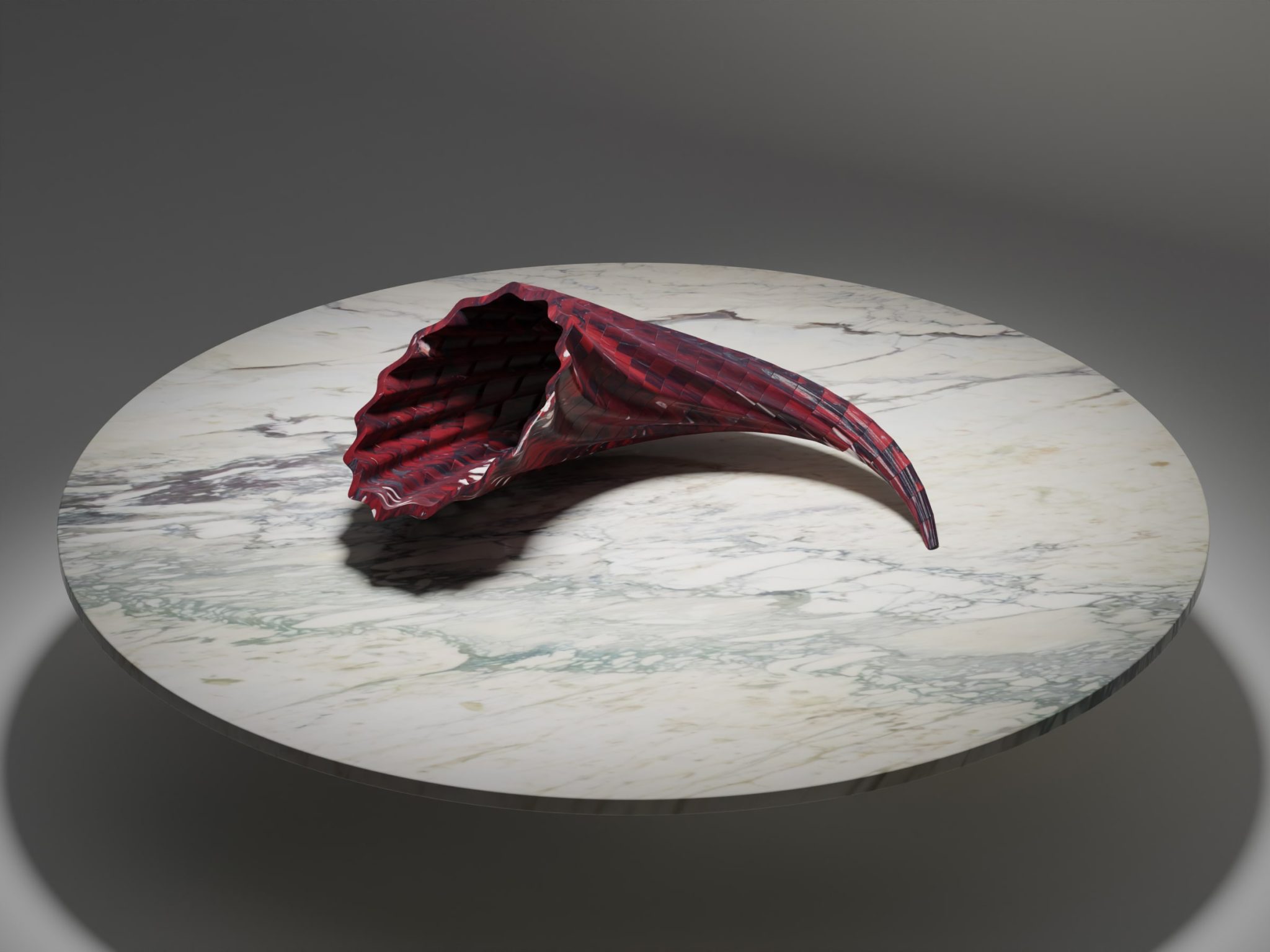 L’antico corno dell’abbondanza, simbolo di prosperità, è realizzato mediante taglio water jet ad anelli concentrici. La sovrapposizione degli anelli in continuità di superficie dà origine alla particolare forma elicoidale, cava e rastremata.