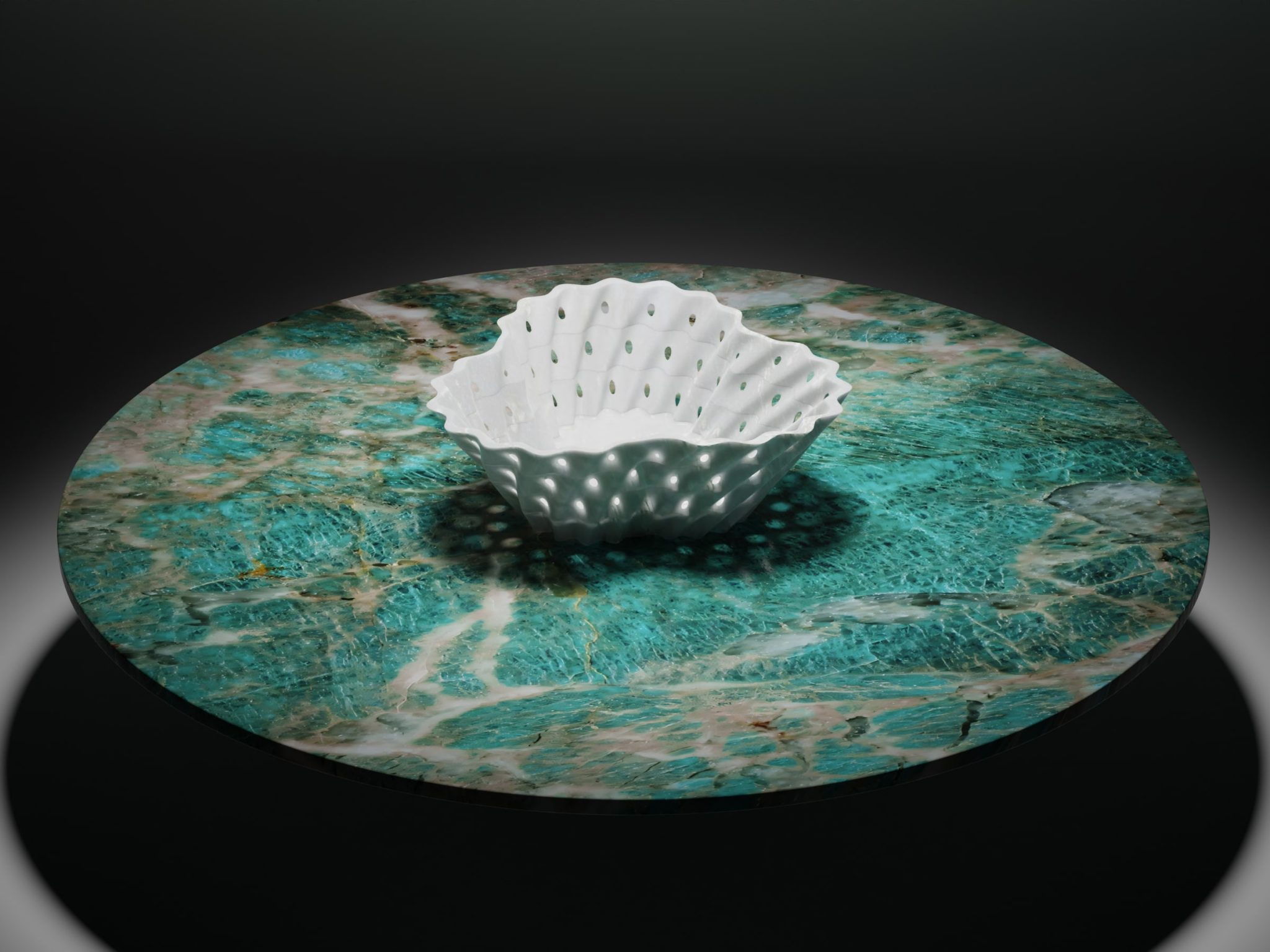 L’installazione “Viaggio al centro della tavola” si propone come una variopinta ed affascinante composizione di tavoli in pietra naturale formati da un piano d’appoggio ricavato da lastra e un centrotavola lavorato finemente con le più avanzate tecnologie numeriche. Uno straordinario viaggio nel marmo, alla scoperta di diversi litotipi colorati e delle loro specifiche peculiarità, visibili sia in forma di lastra bidimensionale che in versione tridimensionale di oggetto di design.