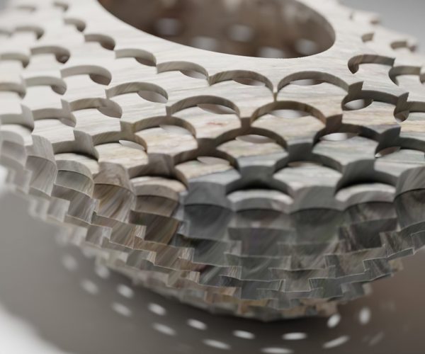 Il contenitore traforato e scanalato è realizzato sovrapponendo tre anelli lobati tagliati a water jet. Il preciso intreccio dei percorsi inclinati di taglio a cinque assi consente simultaneamente la produzione della superficie ondulata e delle forature.