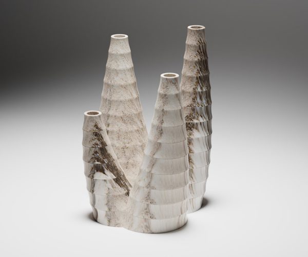 Prendendo spunto dal caule nodato delle erbe graminacee il quadruplice candelabro è realizzato esclusivamente da tagli water jet da lastra piana. Le scanalature orizzontali sulla superficie perimetrale dei singoli elementi sovrapposti derivano dall’inclinazione del taglio sul percorso circolare.